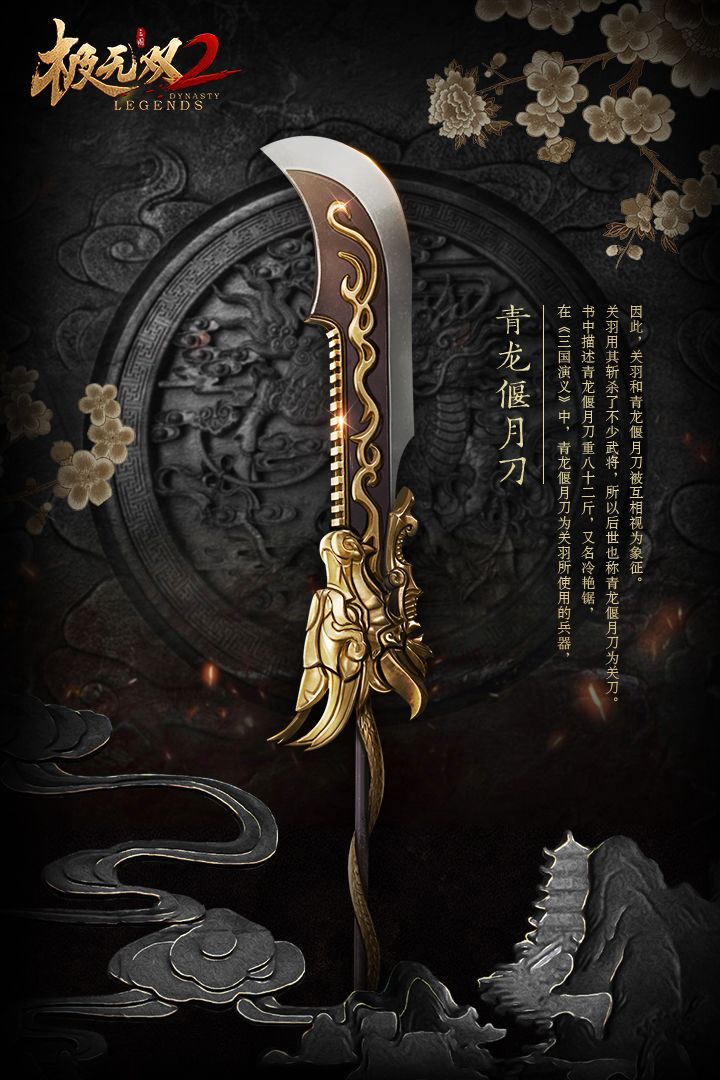 游戏想要玩得好,三国趣事少不了各位将军本周的风物志来了,快来一起看看吧~上次小煮给各位将军介绍了方天画戟和丈八蛇矛后,有将军说想看青龙偃月刀,那么今天小煮就来介绍一二。青龙偃月刀,重八十二斤,又名冷艳锯,关羽用其斩杀了不少武将,所以后世也称青龙偃月刀为关刀。相传,天下第一铁匠只选月圆之夜打造它。完工时,突然风起云涌,从空中滴下1780滴鲜血。当地术士分析,那是青龙的血。所以,有青龙偃月刀之