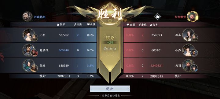 1V1今天淦了个氪金大佬,非常舒适,输出面板来看就是险胜。徐庶夏侯惇大招伤害打中非常高,一定要计算对面的技能冷却和闪避冷却时间,不然很容易空技能,小乔技能可以边跑边给自己加血很管用。