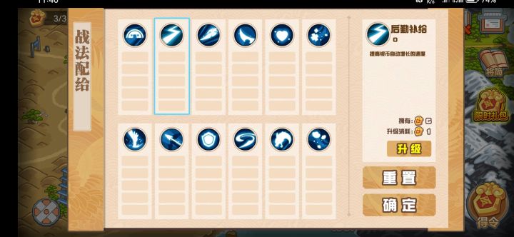 昨天玩了一会儿,今天再打开发现存档没了,重新过了一关,左上角可以看到有三点,战法配给显示有六点,但是点升级没用