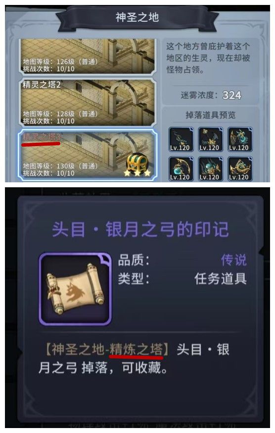 ①回声之地风暴法师掉落的印记应该是乱石之地吧,之林是祈愿者。②副本里神圣之地是精灵之塔,收藏里是精炼之塔。