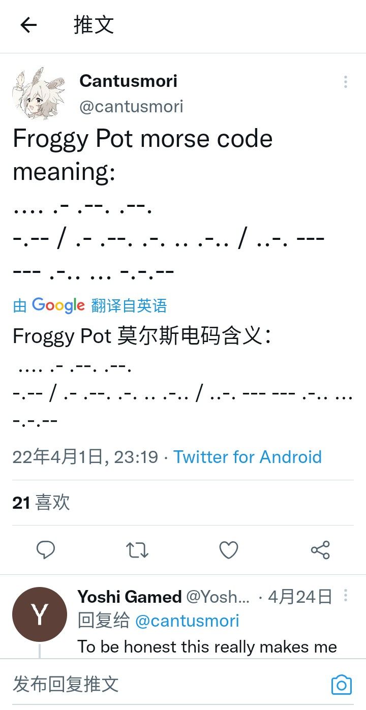 对于游戏的补充(来自网友分享)1.输入名字“Froggy”触发坏结局2.输入名字“Sapphie”或简写“sap”触发彩蛋3.关于游戏中关于的摩斯密码(官方回复别人时,说是“愚人节快乐”的意思)