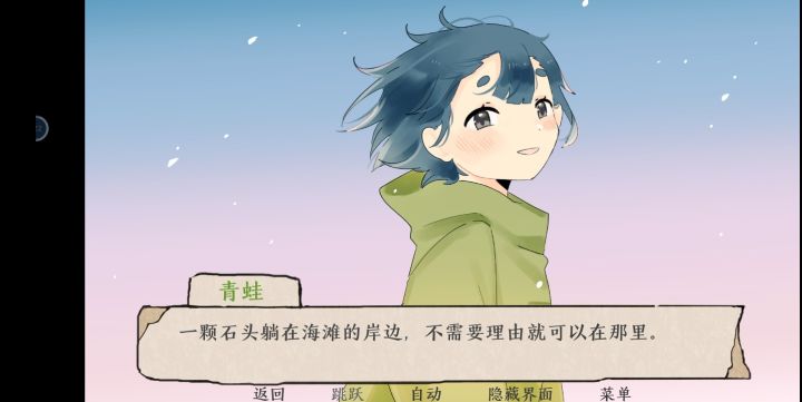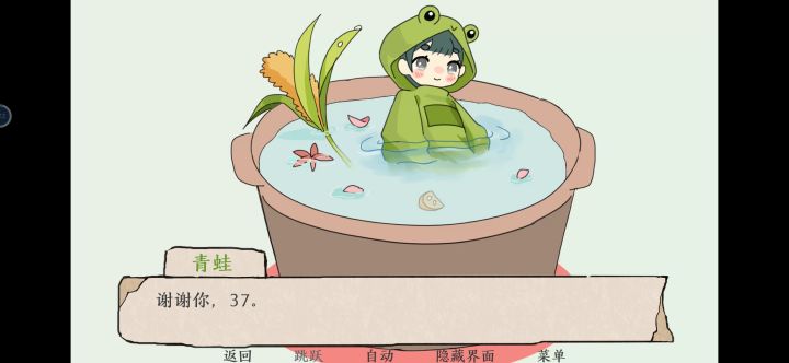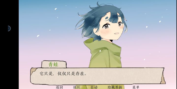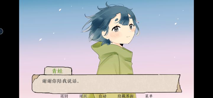 开头感觉仿佛有一个跟我想法很像的青蛙在跟我聊天。挺温暖的感觉。后面“我”变成了一个拯救者的身份,个人更喜欢开始时的定位,还想着难受时可以跟这个画风些许潦草的堕落小青蛙聊两句。忘了是个短短的视觉小说。一般吧