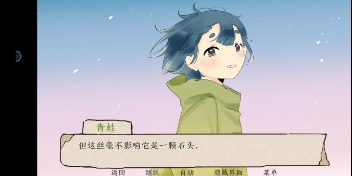 一开始我就知道这是治愈游戏 直到游戏进行到一半 我甚至无感 站在第三者的角度在局限的选项中尽可能选出我觉得有意思的答案 然后到了它在怀疑自己是不是自言自语时 我内心是有悸动的 因为我是一个活生生的人 除了它有一个难忘的“她” 其他我们没有不一样 尽管如此 但我觉得我与它不一样 我不喜欢自言自语的感觉 所以我也不希望它陷入其中 我独立意识不强 自从我有这种意识起 我就不断要求自己去找寻自我 因此我觉