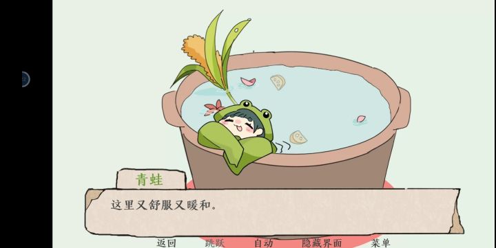 我觉得这个游戏算一种相互救赎的感觉,青蛙亦是我们,在这个忙忙碌碌的世界前途一片迷茫,但又不愿意做出改变,在不断劝说青蛙离开锅的时候其实也是在劝自己可以做出一些改变,加油陌生人