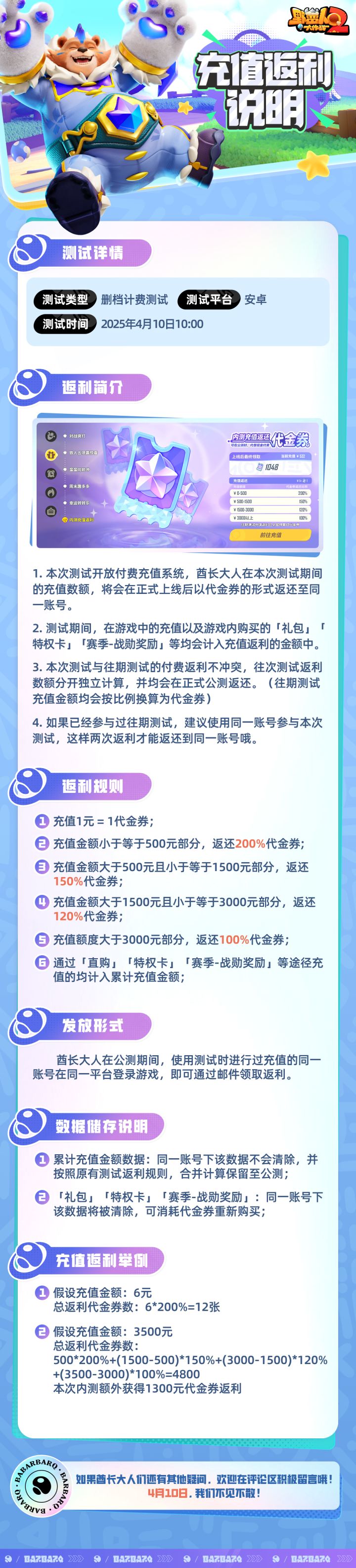 巴拉巴巴巴~告诉酋长大人们一个好消息——「坠后测试」已于今日10:00正式开启!什么?你问我这次测试有没什么福利?好吧,走近点俺悄悄告诉你我从格格菇哪里听说到本次测试一定要冲到钻石段位好像是可以解锁什么蛮蛮烧烤皮肤等公测上线后使用"同一账号同一渠道"登录该皮肤会作为老玩家福利免费送给大家~酋长们冲冲冲!我在蘑菇哈拉等你!◈测试时间◈「坠后测试」正式开启时间:2025年04月10