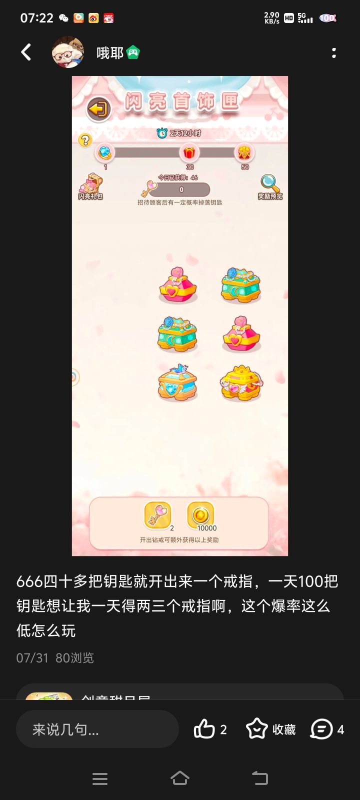 666四十多把钥匙就开出来一个戒指,一天100把钥匙想让我一天得两三个戒指啊,这个爆率这么低怎么玩