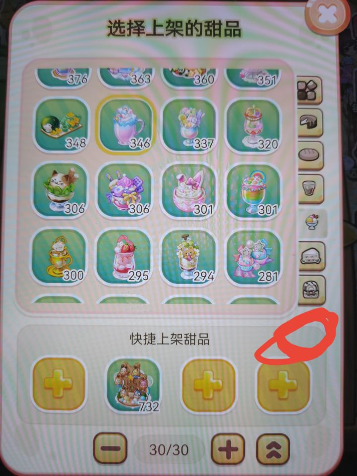 能不能在这增加个已有配方的格子呢???本来心情不好玩会游戏,上甜品挑的眼睛快花了,更烦躁了!之前也有玩家提出过这个问题,就是不优化,是出于什么原因呢??加个格子很麻烦?故意为难玩家么还有这个快捷上架太鸡肋了,我一换甜品柜装饰物就要重新加一遍