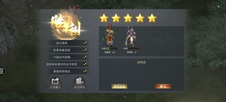 第3关:青州诱敌战⭐ 过关提示 ⭐1. 本关5星难点在于刘备和龚景的对话2. 刘备需要赤兔/绝影在6回合内抵达位置3. 管亥留到最后打4. 管亥没有逃跑,而是被直接击退,可以获得皮手套⭐ 星级条件 ⭐★战斗胜利★刘备对话龚景★击退管亥★我军无人撤退★胜利时回合小于7#攻略#游戏安利#游戏推荐#游戏讨论#单机游戏