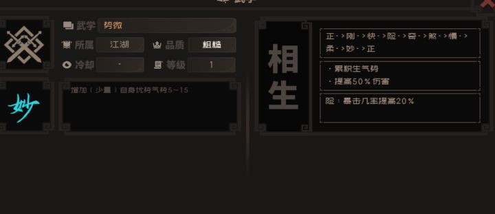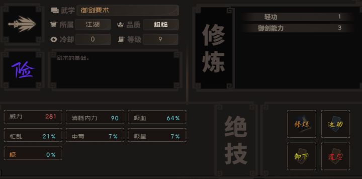 ①资质(不知道啥用)体质(血量上限会提高)我随便刷90,30②御剑(有的武功达到一定数值才能学习)学习相应武学并升级可以+,其他同理③轻功,越高跑图需要时间越短(修炼时用轻功跑得更快)④招架(招架成功使对面攻击无效化)⑤集气(越高出手速度越快)⑥势(正—刚—快—险—奇—煞—慢—柔—妙—正9种,每种武学需要相对应的势气值才能出招),战斗界面左右两边人物状态栏会显示势的多少,出招可以选择集势