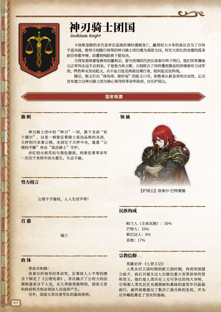 ——公理不予强权,人人生而平等!【更新批次】:第十七期【更新日期】:20220830【更新篇幅】:艾尔兰斯编年史(已完结)——帝国风云录(完结)——第二次大分裂时代(更新中)——???【前方高能】:①神刃骑士团国的政体与文化。②骑士王,洛泰尔。③公理是斩断王权的利剑,而挥动它的正是所有渴望尊严与正义的普通人!
