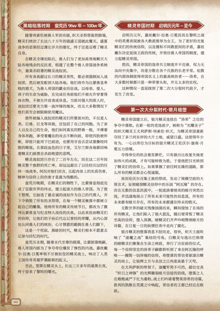 ——日泽万物,乃有自然!【更新批次】:第九期【更新日期】:20220810【更新篇幅】:艾尔兰斯编年史(已完结)——帝国风云录·人类帝国(已完结)——精灵帝国(更新中)——??【前方高能】:①精灵最不愿提起的历史——黑暗陷落时期。②选帝共主制度。③第二位永夜者的诞生,初代银月的暗堕。④精灵族群的分支——白精灵、太阳精灵、暗精灵、银月精灵。(PS:游戏demo版本的美术实机效果方案