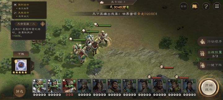 #新三国志曹操传创作者激励2026 最后一层难度还是挺高的,最好上阵武将都带30兵书。第一关:马超,周仓,随意这关相较于前面难度高了不少,马超大招秒不了怪,所以要操作一下先全员后退,在后面平原上享受地形再反击,然后过关第二关:诸葛、庞统、赵云、张飞主要还是看运气,打法和95层差不多,张飞在神兽中表现不错,伤害也高,群体混乱提高了续航,注意驱散错开技能使用就行了第三关:马云禄、刘备、徐