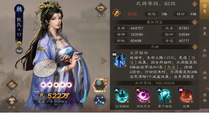 #新三国志曹操传创作者征集令 核心定位与强度 T0级护盾辅助,PVP人权卡,同时适配高难PVE副本。其核心价值在于顶尖的负面免疫与清除能力,以及通过护盾实现的全队常驻减伤,是防守反击与攻坚生存的关键。 技能解析 1. 天赋(文贤昭世):核心机制来源。- 生命上限+25%,提升自身生存。- 每回合开始,为菱形3格友军施加1层“免疫”(可叠加至2层,免疫两次负面)。- 自身行动结束