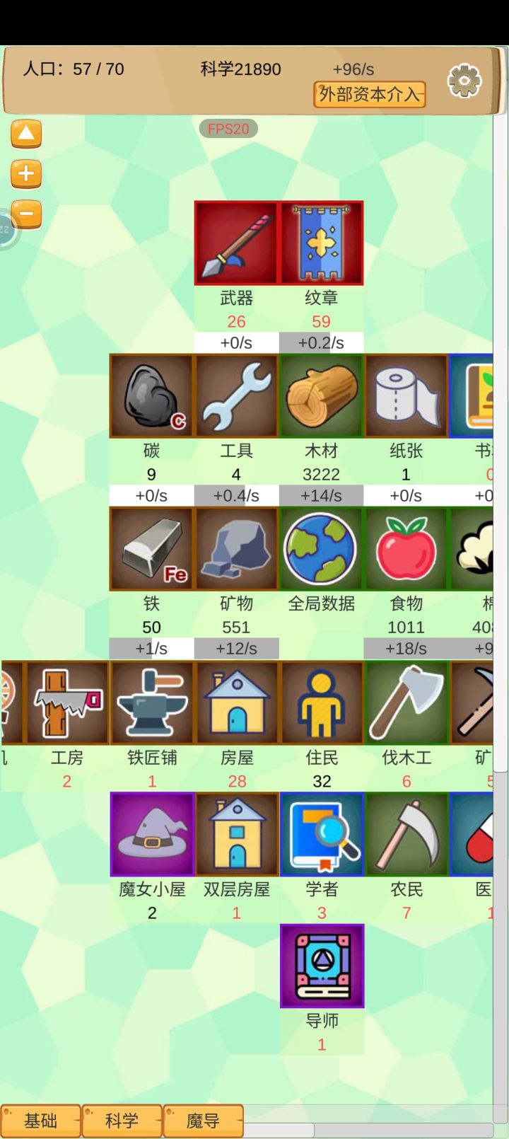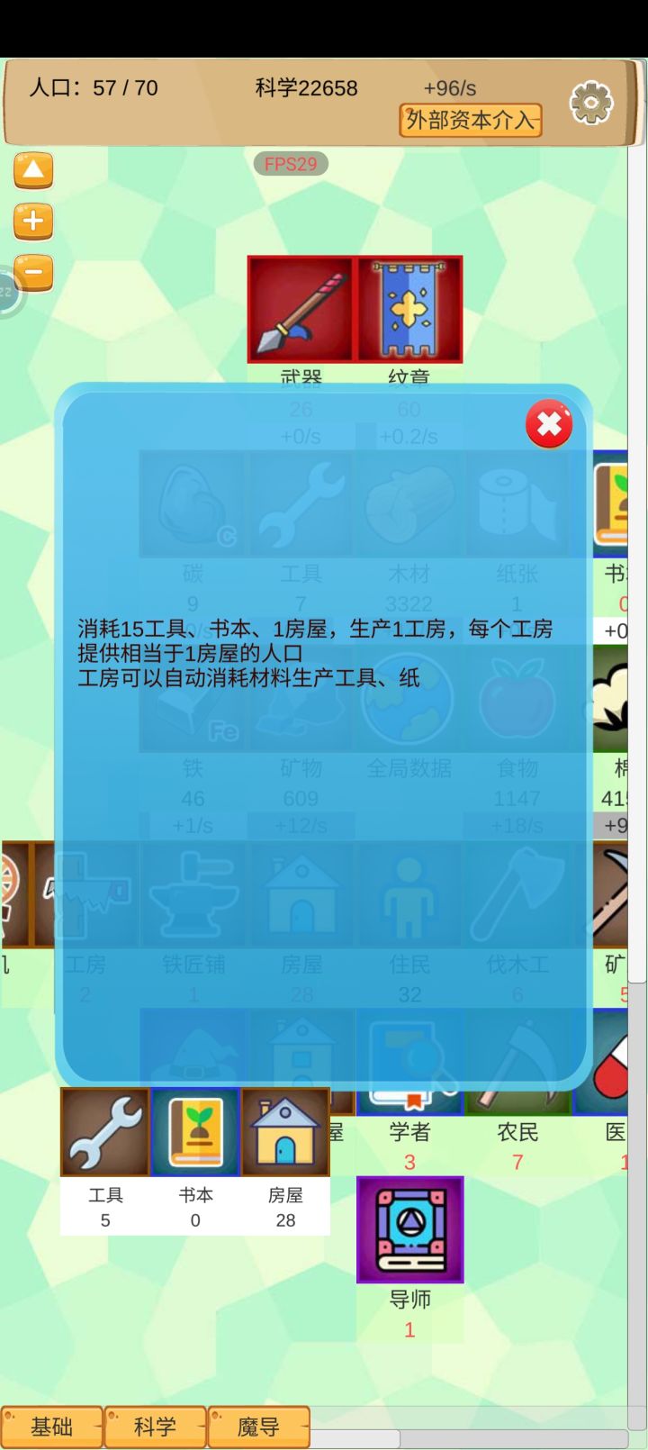 发现有一处游戏内的实际情况与科技描述不符:图1中,制铁技术为6级,制作技术为1级,按照科技描述,工具的生产速度加成应该是20%,而实际上工具享受的是制铁技术的加成,而不是制作技术的加成