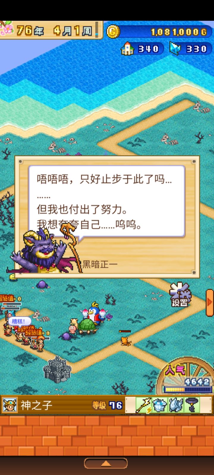 第七张魔界地图。一、五星进程二、BOSS图鉴三,其他结算时点还有很多道具没使用,另外钱也能转化成人气,结算成游戏点。但实在太肝了,手指都点出癌症了,就算了。90个评定拿了89个,有个没拿,原因后面说明。前几名村民的勤奋度和装备情况。不是最强装备,因为装备不重要,村民本身属性才是根本。至此,游戏全部通关。个人感觉,7张图,历时20年,应该能全部通关,也就是21年4月前通关。当然需要大