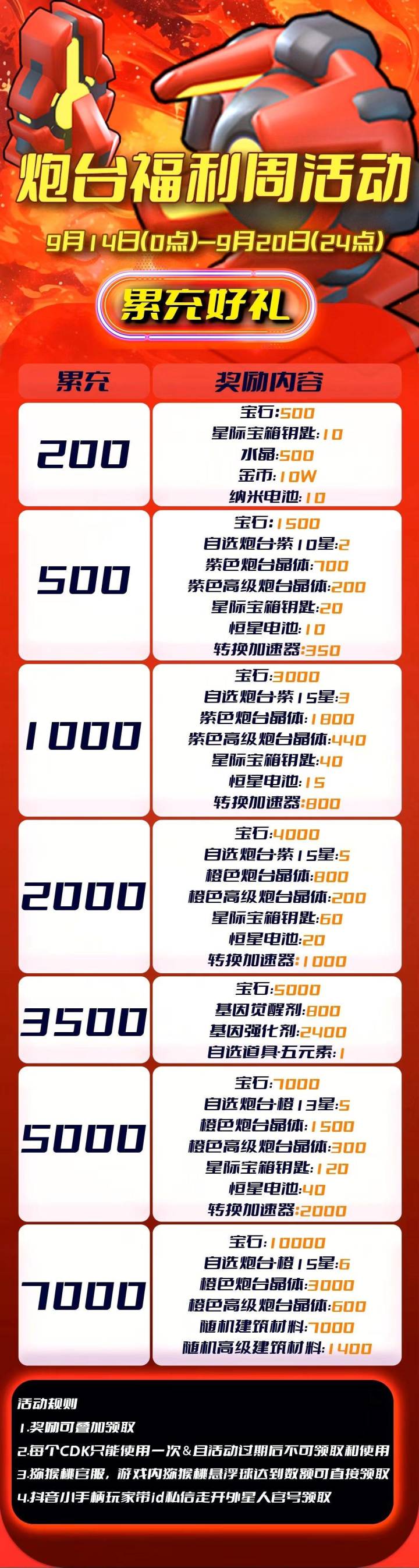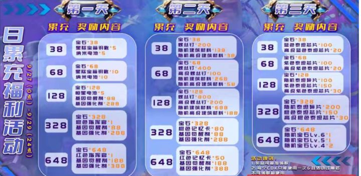 以上活动所有奖励礼包码有效期截止到9月29号23点59分哦!活动每天的奖励不一样,每天只能领取对应的奖励!活动第三天奖励9.29号18:00截止过了时间就不予参与哦!9.27日-9-29日日累充福利活动! 详情咨询游戏群客服了解! 客服(qq:2853861296) 【走开外星人tap交流群】: