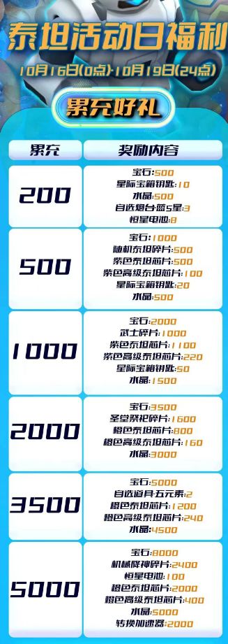 以上活动所有奖励礼包码有效期截止到10月20号23点59分哦!10月16日-10月19日累充福利活动!活动期间叠加领取奖励哦!详情咨询游戏群客服了解! 客服(qq:2853861296) 【走开外星人tap交流群】: