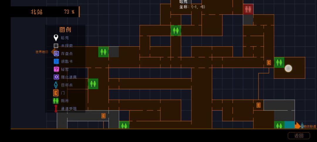 三河废墟79%应该是最高进度了,其他走不了的地方大部分是黄黑砖块挡路,还有一个小通道里的砖块阻挡回去探索的可能。(404地堡可解锁,但是否为80我不知道,因为LZ菜啊)附上返回三河废墟视频,请一定要记得先清理视频中头上的砖块然后再进行大跳+上劈+冲刺的操作。视频链接:纽三河60%,坐标(0,1)需要从上面落下的时候用冲刺然后一直往右普通解锁,有一个白色齿轮,酒吧里间左边暂时无法继续探索。纽三