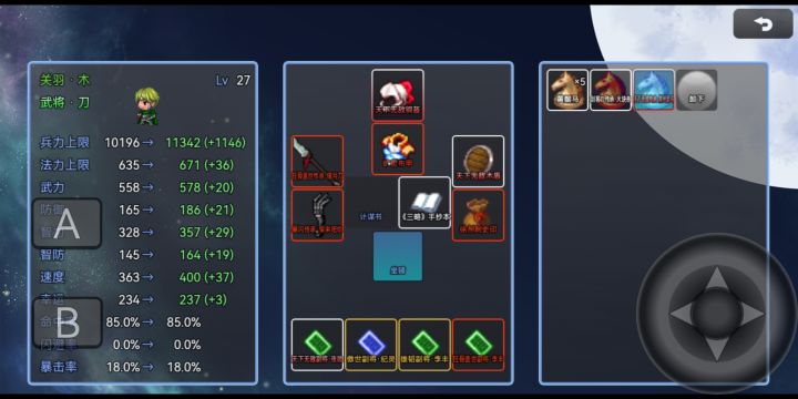其他都挺不错的,就是这个命中呀,每次一回合攻击5个武将,能命中3个已经算好的了,每次未命中心中莫名的憋屈,还有就是查看装备详细属性还得打来虚拟按键太麻烦了。最后就是自动挂机了,开自动卷轴战后结算界面不会自动点掉一直在界面。制作团队加油吧,吞一就很好,怎么到了吞二就成这样了呢,按理说有了制作吞一的底子吞二不至于做成这样啊。