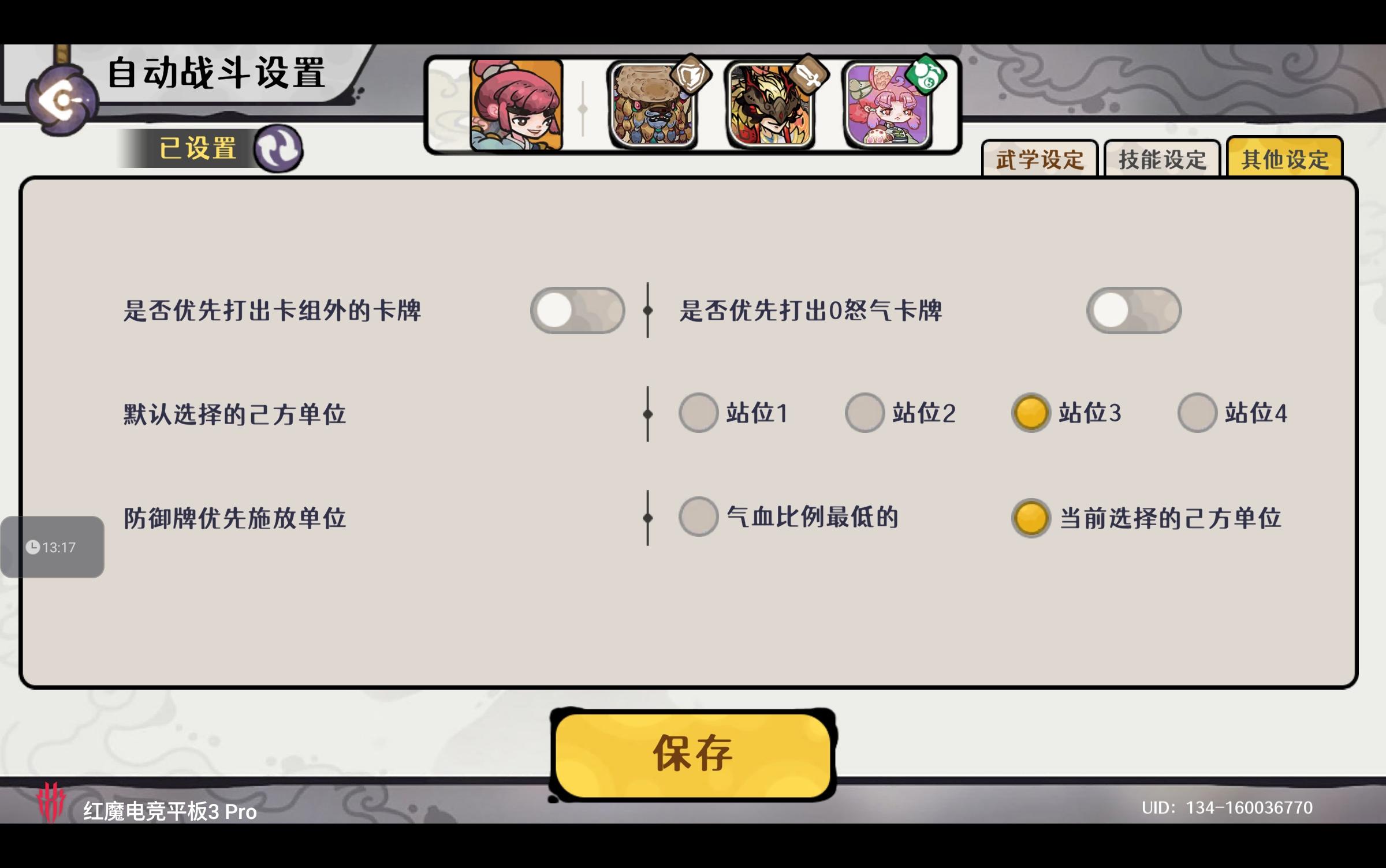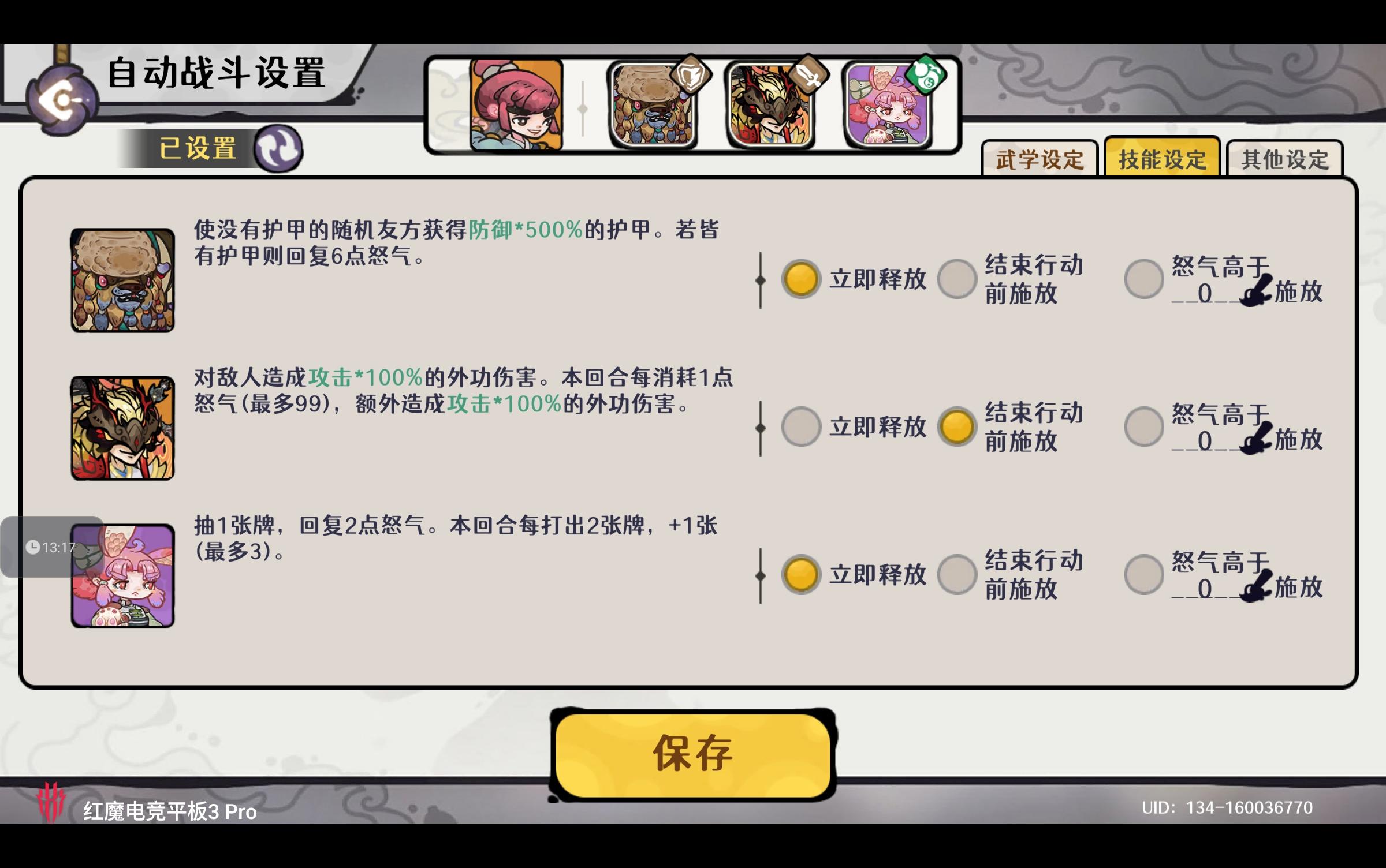 最低:弯弓2🌟,灵童1🌟,炎刃1🌟图1:卡牌选择,最后4张其实没啥用,要么是怒气太高,要么是过牌量太低,只是火系没有更好配合的牌了,凑个数。神兵:能回怒的就行(长期下来尽量抽3把通用的,以后任何阵容都能用:如赤霄,绝情,祝融)图2:自动顺序:弯弓装备升到五星,自残两次就会拿回武学,且消耗只有1怒,要优先打出,不然会浪费自残的次数,炎刃武学和破釜沉舟第二顺位打出是为了给后面的赤焰诀辅助摸牌回怒
