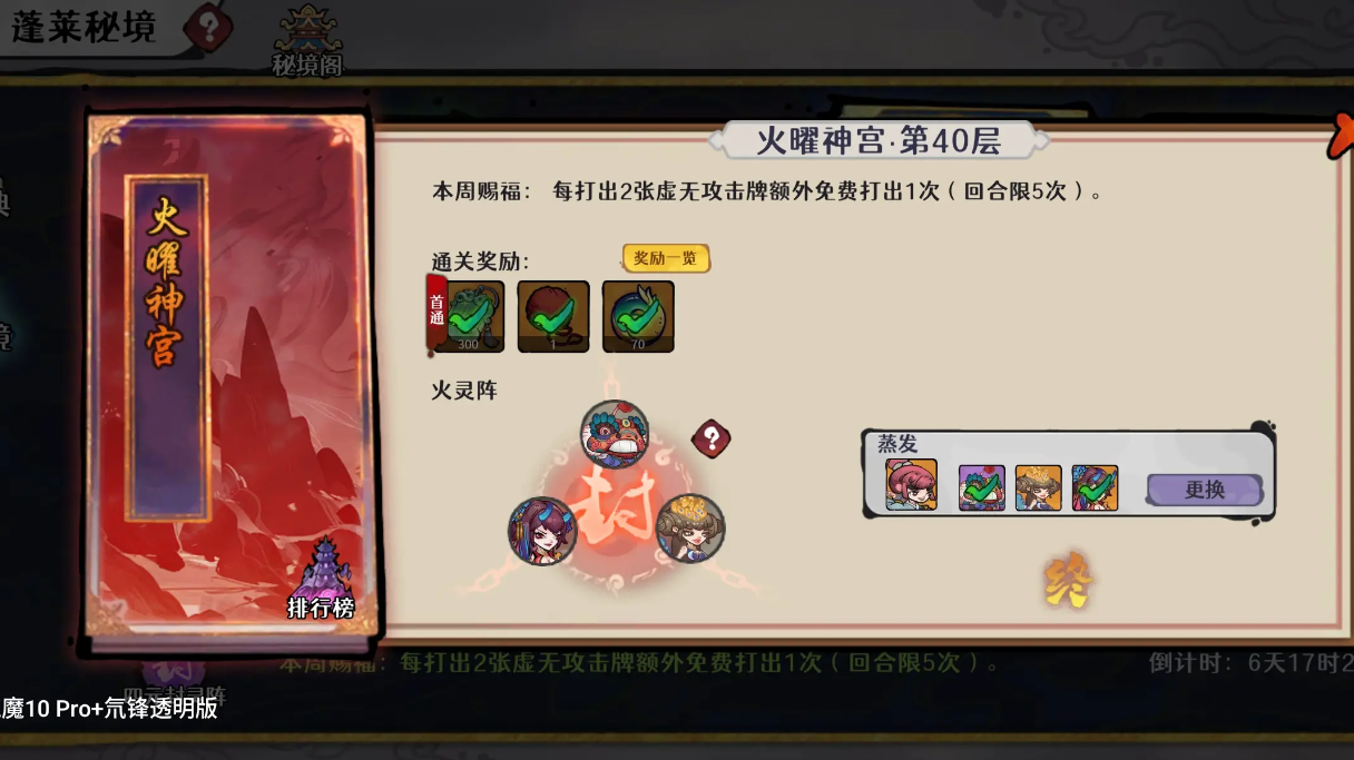hello 大家好,我是夜月神!今天给大家带来一期蓬莱秘境火曜神宫,火系蒸发队手动阵容推荐、装备搭配、武学设定、技能设定、其他设定以及灾祸25⭐选择,这套搭配基本为毕业版。如果萌新们武侠或者武学没有的话,可以参照此贴慢慢补。 一、登顶前的准备工作 确认每周封顶层数。每周首次打蓬莱秘境前,请务必确认当周的封顶层数。具体可以点击【排行榜】查看【进度奖励】,最高一层进度奖励的层数即是【当周封顶层