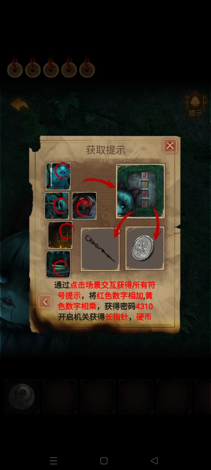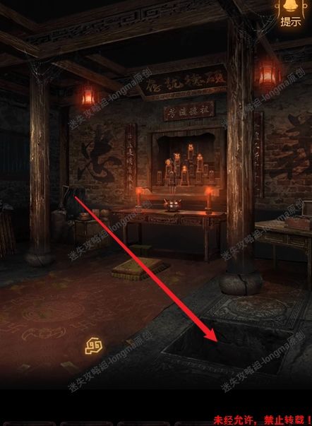 攻略作者:迷失攻略组-longma未经许可,禁止转载,侵权必究! | | | | 第四章84.顺着红箭头来到宗祠,点击地洞,进入密道。8485.前进来到过道,查看左边墙壁,获取【手臂木雕】,查看右边墙壁,记住篮子上的黄色数字6。8586.返回洞口,将【手臂木雕】安装在左边石台上,放下大木箱,拾取木箱后面的【大铁锤】。8687.来到过道,对左边墙壁获得木雕手臂的位置使用【大铁锤】#攻略#单机游戏