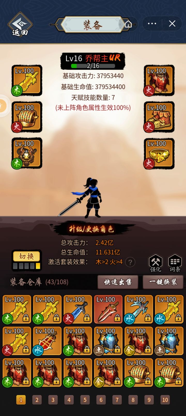 装备使用六件木属性般若套神器。极限关卡输出不够可更换六金(武功选用时需要配合两剑)