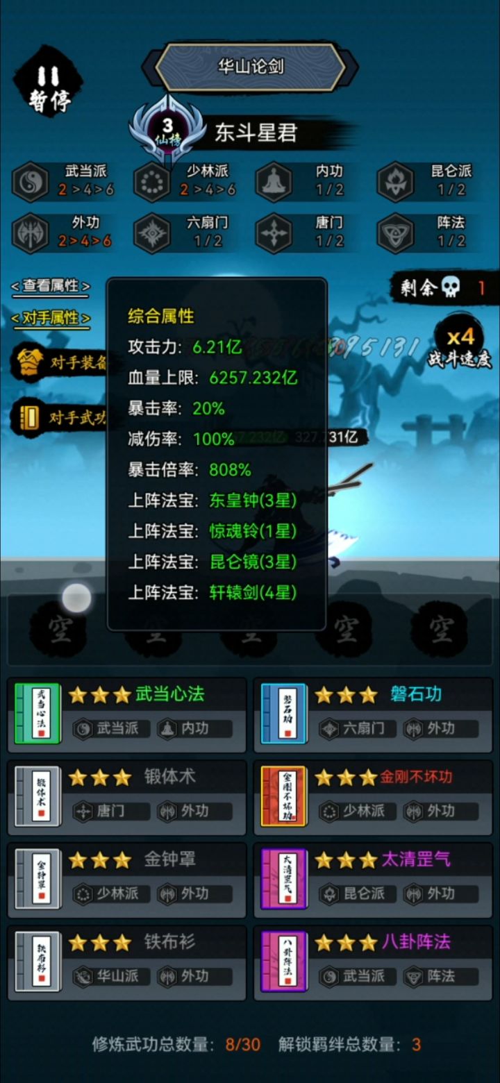 仙4过法由于仙4带翻天印,8阶外功减伤100,仍然被秒杀,换了4剑,比他速度快,2刀加暴击,玉女太极,带女娲石,太极套赌。仙3过法8外,人物郭,法宝铃铛对位鼎,带钟,靠反伤过。
