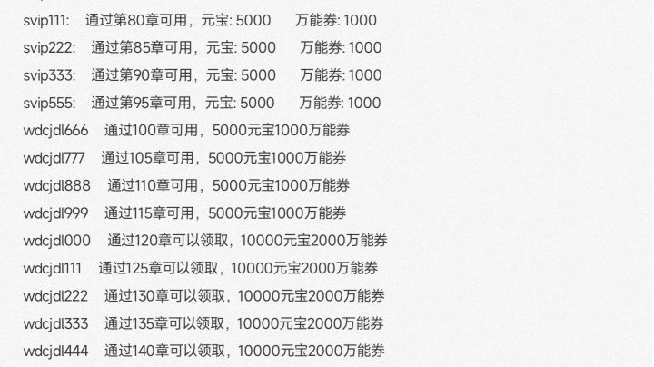 当前版本福利YL666 1万金币YL888 500元宝YL999 50万能券VIP666 通过第5章可用,500元宝+50张万能券VIP777 通过第10章可用,1000元宝+100张万能券VIP888 通过第15章可用,2000元宝+200张万能券VIP999 通过第20章可用,2000元宝+200张万能券VIP000 通过第25章可用,2000元宝+200张万能券VIP111