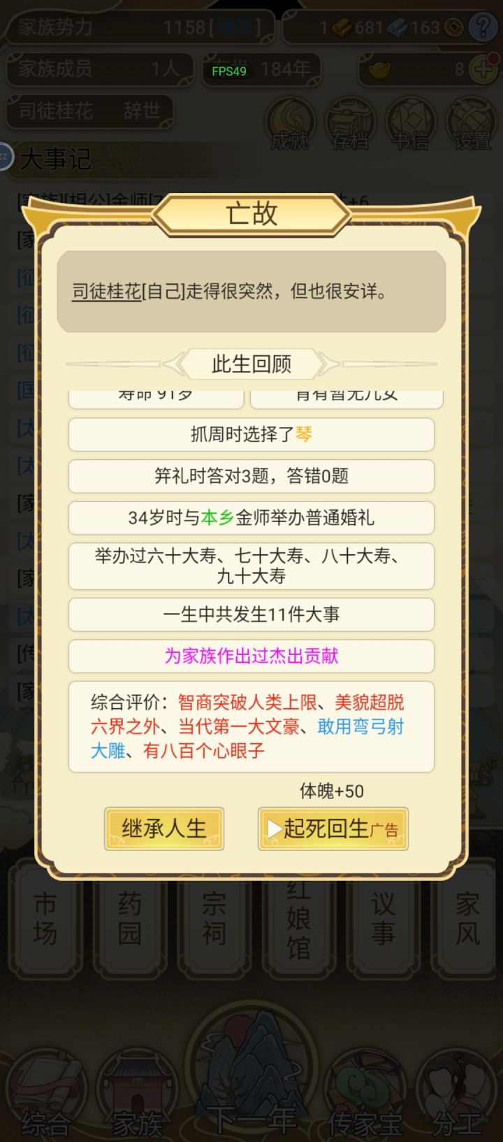 玩了一段时间基本财富自由了。总结了一下,给开发者反馈点意见,玩家作为参考。1,宗族观念不够直观。只能追溯到上三代,下一代家主继承后,同辈旁系都会被清除,不会出现在家谱里。家谱的格式可以参考一下树状图形式,旁系后代不再更新就是了,没必要直接消失掉。这样玩家点开家谱后还有点成就感,能条理清晰的看到自己家族的嫡系传承。2,游戏的重复性太高了。到了中后期基本就是宗祠祈福,升官,家里人入仕之后一路干到一