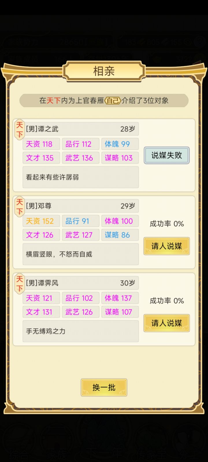 我就不明白了,为啥每年只有三个子嗣家庭能生孩子,这就造成到了三代的或者三代以后的生孩子的时候二代的根本就生不出来,特别是家族人数大于一百以后,年纪小的二代生育率一下就被下调了一样。