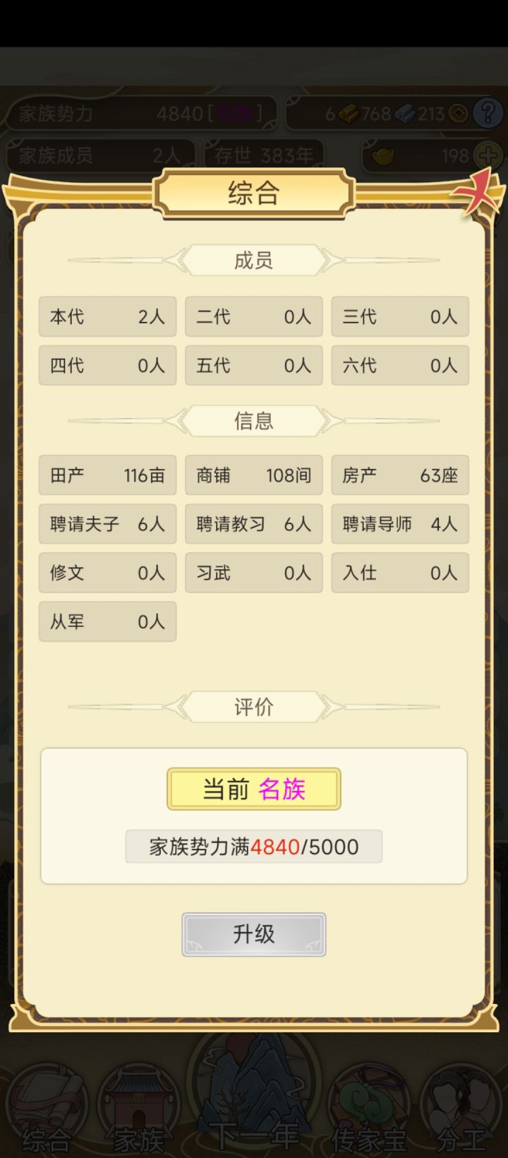家族势力就差点就能突破5000,止步于此,突然没意思了......我就不能路边捡一个?之前分家的都没了?
