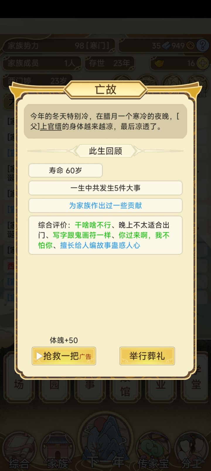 四五代后,后代属性过低,而且不知道为什么,谋略几乎全往10+靠了,出个红等长大后总属性也变成了废物,除非当代族长立刻暴毙给红孩儿他爹继承家业体魄略高但优秀的也不过七八十。属性随机加点这个是否可以考虑一下人口基数大的情况?还有药园能否指定谁使用。