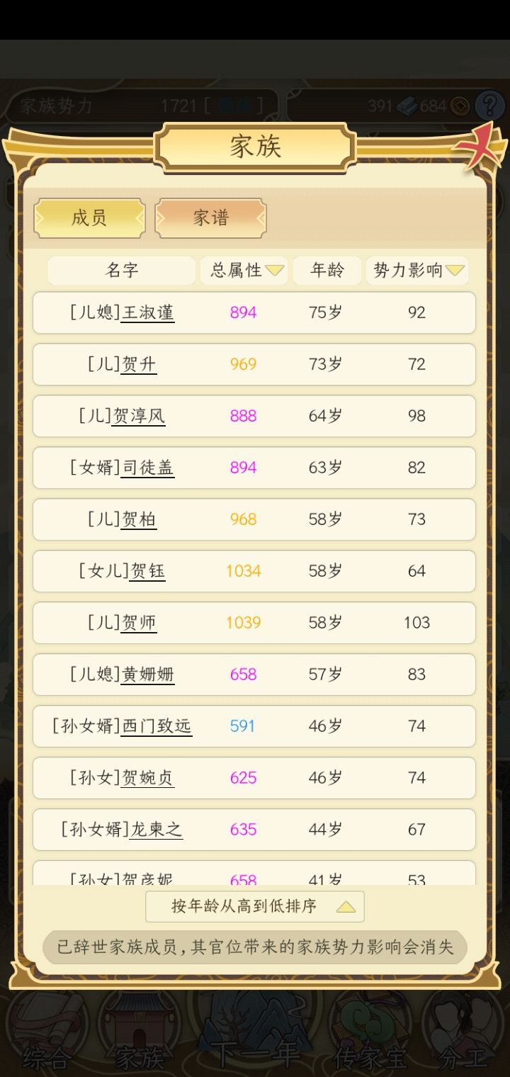 1.希望能职业多样化。2.从事不同的职业根据职位高低发放俸禄。3.事件的处理应与人物属性,家族大小和官职有关(比如我都是四品官职,家族是豪强,家里文武职位的有15人,居然还有官兵过我家拉壮丁,土匪打劫了好多次,这根本就不不可能好不好。还有人物死后评价中有武功天下第一,一人灭一个宗门的,平时居然连个野猪,野狼都打不过,请问你这评价是怎么得出来的,加的武功属性有什么用?)4.婚姻应该化被动为主动