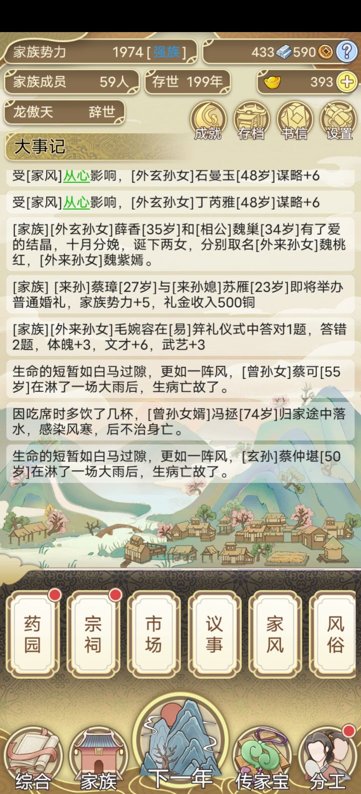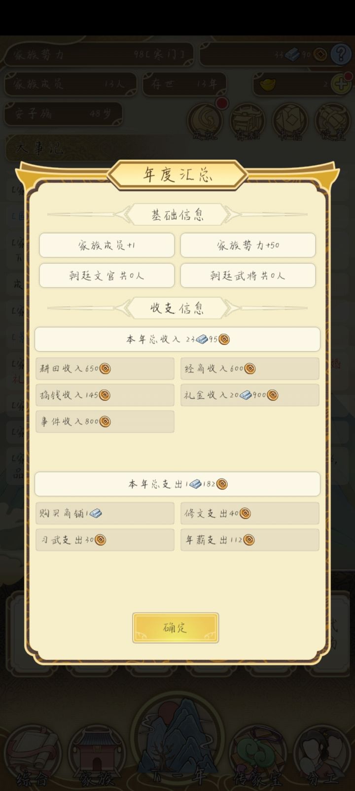 还有成就问题,比如做官和从军,这两个成就是合在一起的,导致我明明手握一个五品通判却因为七品县令一直没有完成,等到县令完成,从军的这边也退休了,同时不知道为什么,刚才测试的一把最多只有一个人当官和从军,其余人一直没有获得官职,有了官职也一直没有工资,纯粹白养。