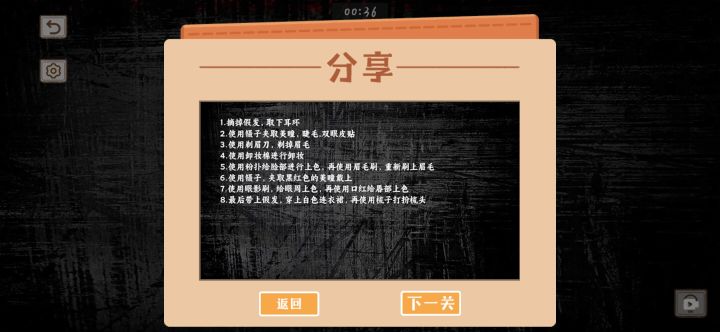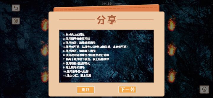 1.古代新娘2.亦庄惊魂(先把铃铛点了,再把小人放好,再摇铃铛,布置过程中要不时点击铃铛)3.兰若寺4.纸人回魂5.恐怖找茬(把灯打开)6.青山医怨7.厕所惊魂8.恐怖邮轮9.闪灵 the shining(开灯)10.老照片11.他们是谁12.恐怖手术室13.曾经的罪恶14.办公室疑云15.长藤鬼校