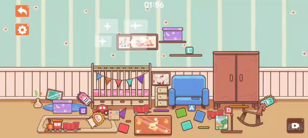 第一步:拖动四幅画墙上便会出现位置提示,根据提示将四幅画挂在正确的位置 第二步:将两个紫色的箱子摆放在衣柜上面 第三步:将包含“ABC”的大正方体和故事书摆放在最上方的木板上,再将小方块“A”“B”“D”依次摆放在下方的木板上 第四步:将花瓶摆放在柜子上,再将白色的玩偶放在柜子旁边的沙发上 第五步:把两个火车车厢连接在左下角的火车后面 第六步:将右下角的木马放在左侧的垫子上 第七步:将安诺塔按照由大到小的顺序从下往上堆叠摆放 第八步:将剩余的方块、三角块、汽车和两个相同样式的玩偶摆放在中间下方的和箱子里,本关完成