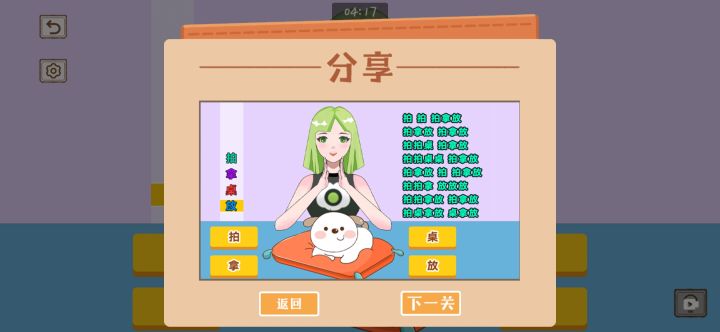 1.文字局2.同桌的你3.熊二仿妆4.拯救地中海5.未雨绸缪6.葬爱家族7.暗黑萝莉8.水族公主9.你好,结芬10.潮牌11.从头开始12.小花返工13.全国统一妈妈14.大嫂请坐15.羊了个羊16.男女搭配17.怀旧找茬18.语言的艺术19.春天的花花