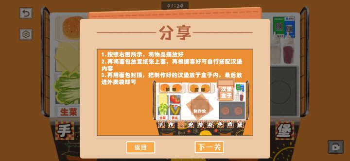 “莎县小吃”一关,先将物品等等摆放好。然后将除豆腐和丸子以外的食物放进三个小砂锅里,盖上盖子。并将四个(不知道叫什么的)食物悬挂起来。最后将豆腐和丸子放进对应的白色锅里。烧烤时,将食物按图摆放好,然后用钢丝球将烧烤架擦干净,最后按照订单,将对应的食物放在烧烤架上即可。