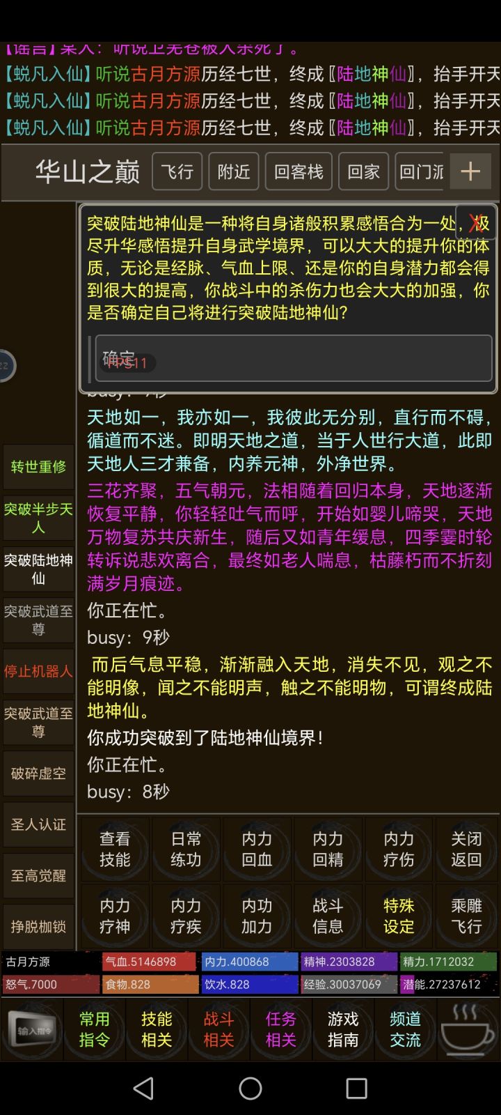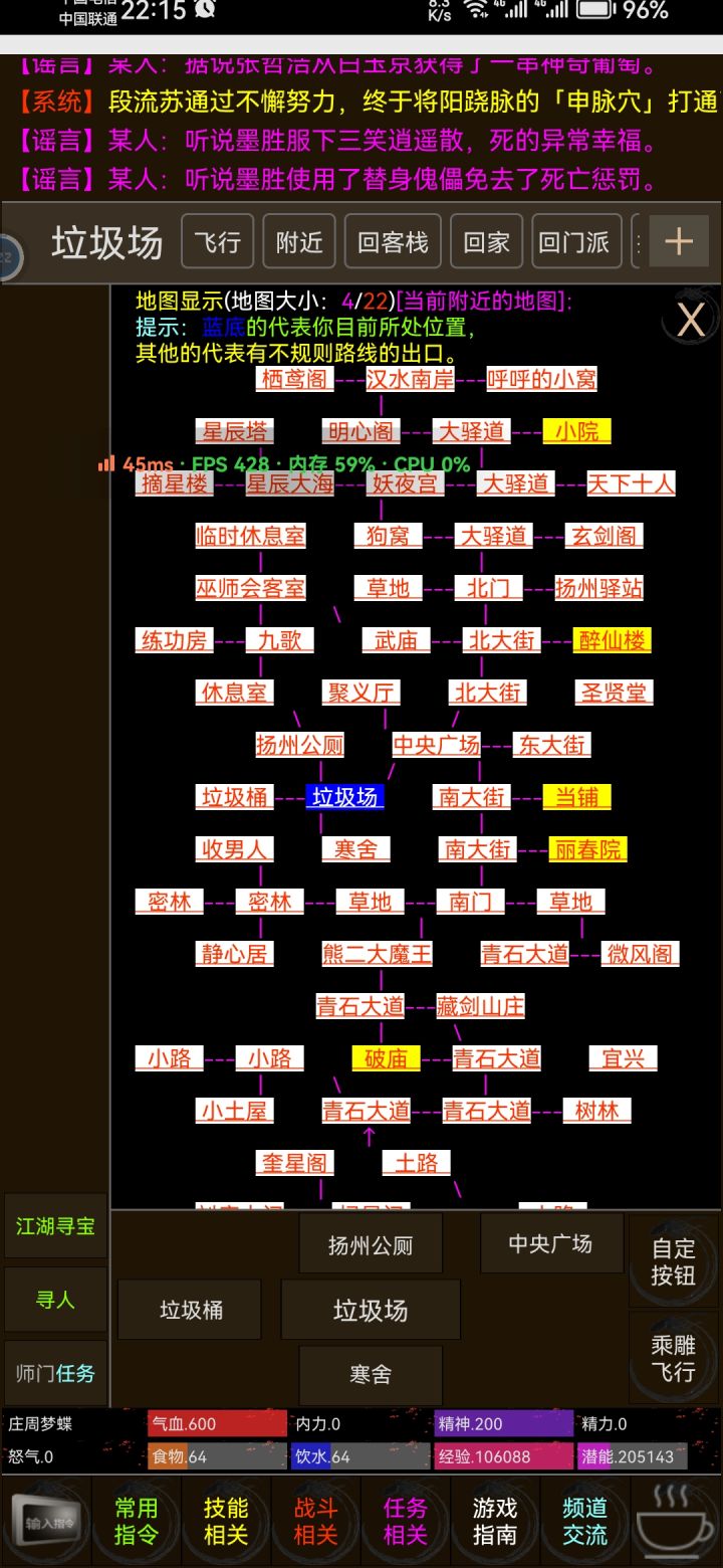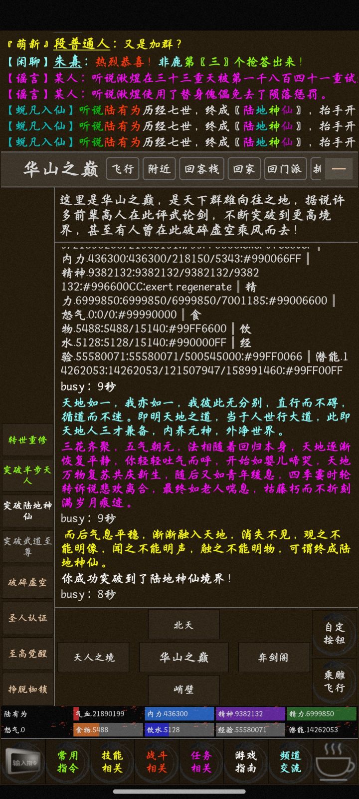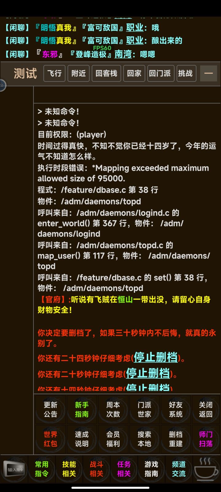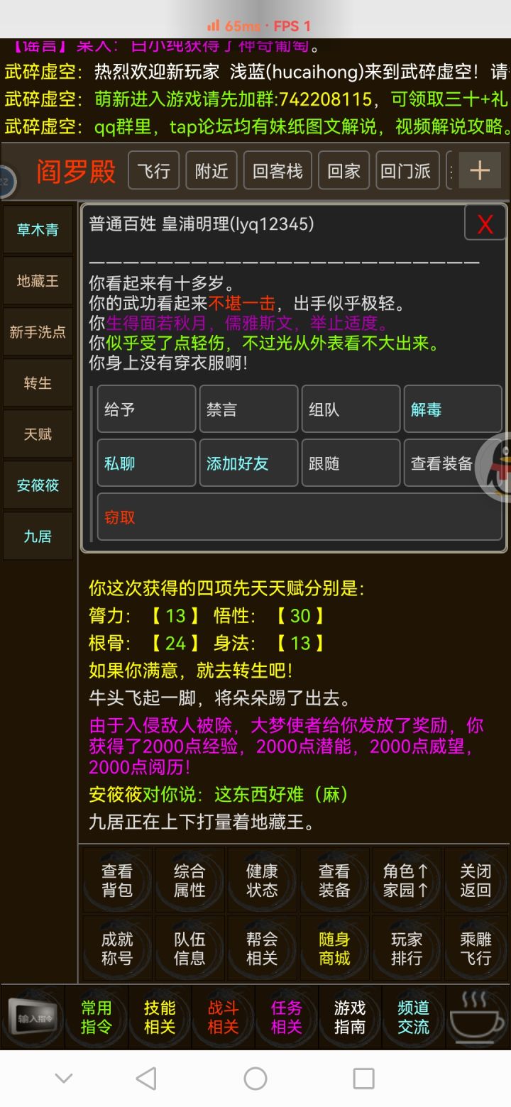 第一次接触mud游戏,初入江湖时属实有些懵懂。 我承认我有些形式主义,看到9.5的高分就不管不顾地撞进了江湖。 开局整个画面跟静止了一样,除了屏幕上方不断闪过的NPC字幕。 傻傻等了两分钟都没看到新手指引后,我萌生了一点退意。 两分钟后我一拍脑门,我真傻,真的,NPC怎么会刷屏那么快呢? 于是我开始寻找和大佬们对话的途径,试图寻找求助的道路。 终于我在一堆文字按钮中,看到了熟悉的“频道”两字。 猛