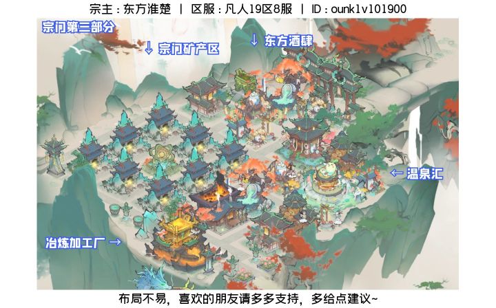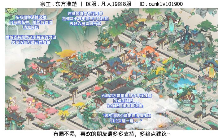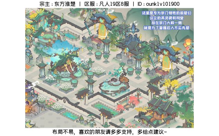 感兴趣的朋友可以拉大图片观看,属实也花了我一些巧思和时间(鼠标点出腱鞘炎了都)宗主:东方淮楚区服:凡人19区8服ID:ounk1v101900#仙宗共创 #仙宗共创 #最强祖师 #最强祖师词条共创 #最强祖师摸鱼修仙 之前就是深度的布局摆放爱好者,很开心祖师能出此类活动。⭐终于终于终于完成了!!!跟各位仙友分享一下我的布局思路:【首先】我是一个强迫症,所有的布局一定要井井有条,但我