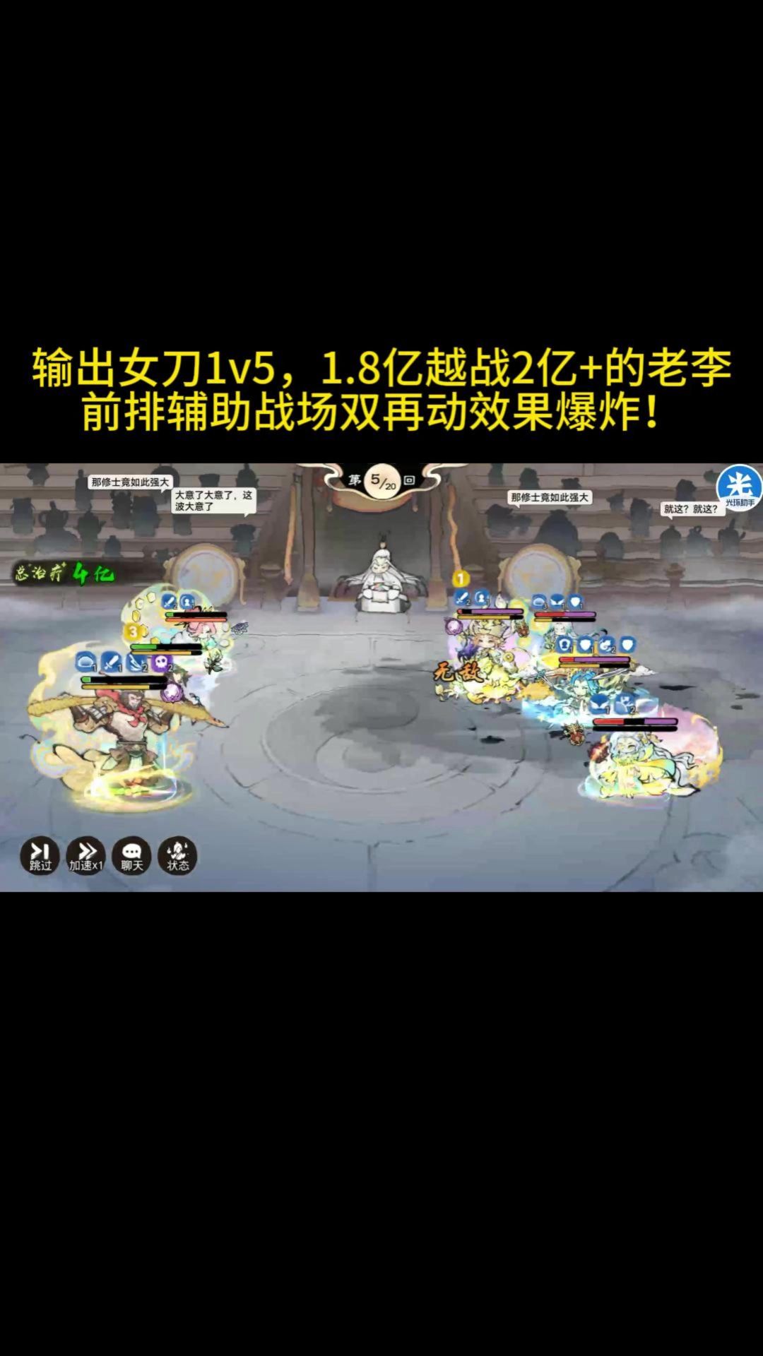 至尊宝,典型罚站半天只玩抽象。为了避免别人说我黑,对面未大成韩立阿离肉队,双方练度基本相同。 附练度:石头人6000w,至尊宝5000w。阿离是紫色200抵抗放前排抗伤的,#标准燃灵肉队。至尊宝第一回合就变身了。