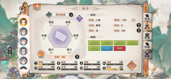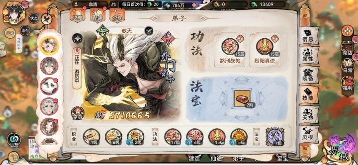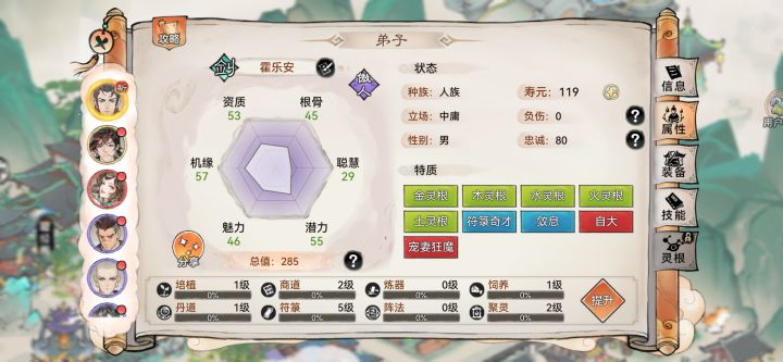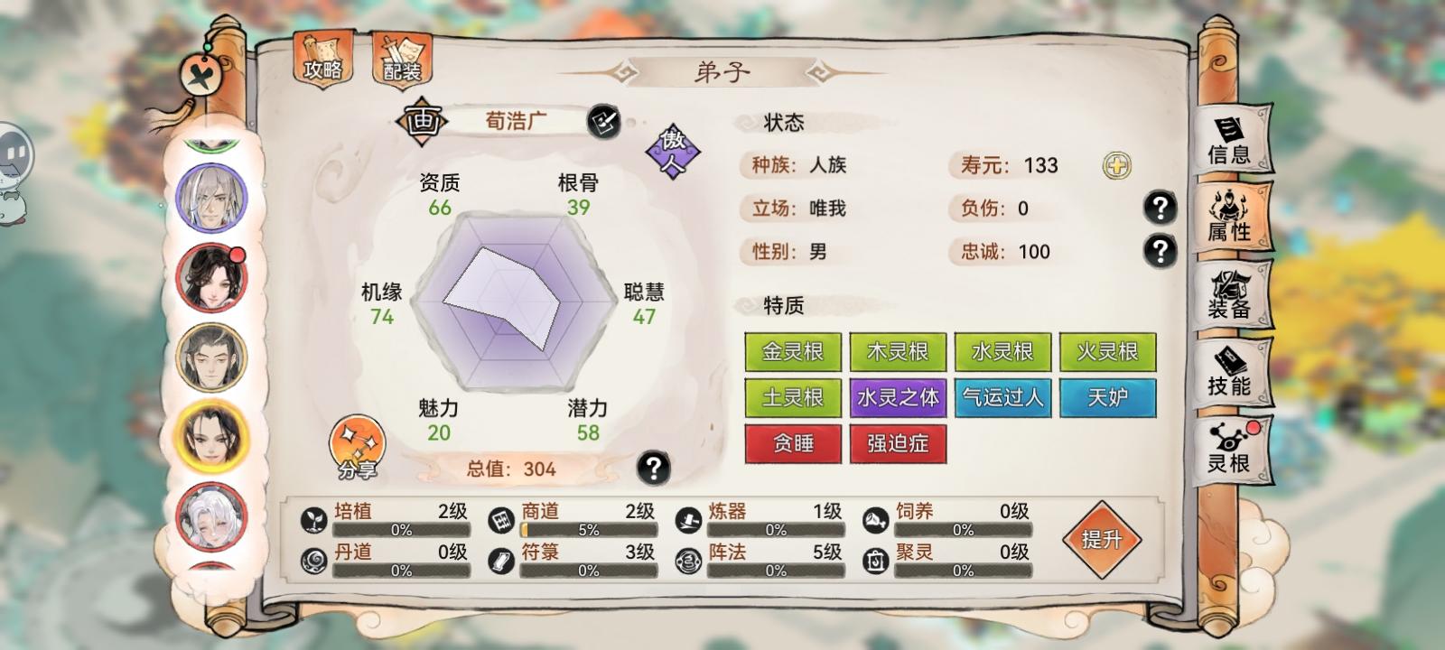 #狂生攻略 狂生是人族弟子,拥有火灵根与土灵根,以火灵根主打输出,土灵根辅助 。天赋上,“浩然正气”让他效果抵抗+10%,面对控制技能更从容;“豪迈”提升魅力与渡劫成功率,助其社交与修行;“以德服人”增加法术伤害 ,契合输出定位。体质“凌云之躯”加效果命中与火系功法威力,还降低火系伤害,在火系战斗中优势明显 技能运用 - 普通攻击:对单个敌人造成160%法术攻击伤害,看似普通,却能触发