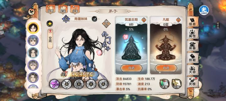 至尊宝,典型罚站半天只玩抽象。为了避免别人说我黑,对面未大成韩立阿离肉队,双方练度基本相同。 附练度:石头人6000w,至尊宝5000w。阿离是紫色200抵抗放前排抗伤的,#标准燃灵肉队。至尊宝第一回合就变身了。