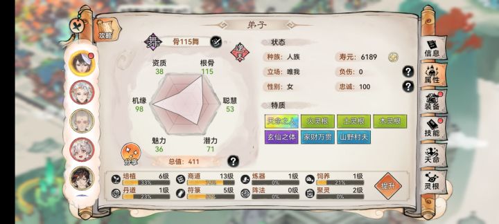 所选六维:体质体质昵称:炉鼎之体特质描述:你来到这个世界唯一的使命就是做为某个不可描述位面之子的传功炉鼎。特质加成描述:潜力-30、机缘-30、资质+15、根骨+15,传功所需仙玉减少30%,根基受损、道基受损、道基崩坏的恢复时间减少50%;