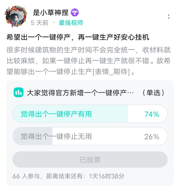 如题,不同意的里面有一部分以为就是单纯一键停产,后面不再生产。我的意思是重置生产时间,安心修仙。#最强祖师#游戏反馈#是小草神捏