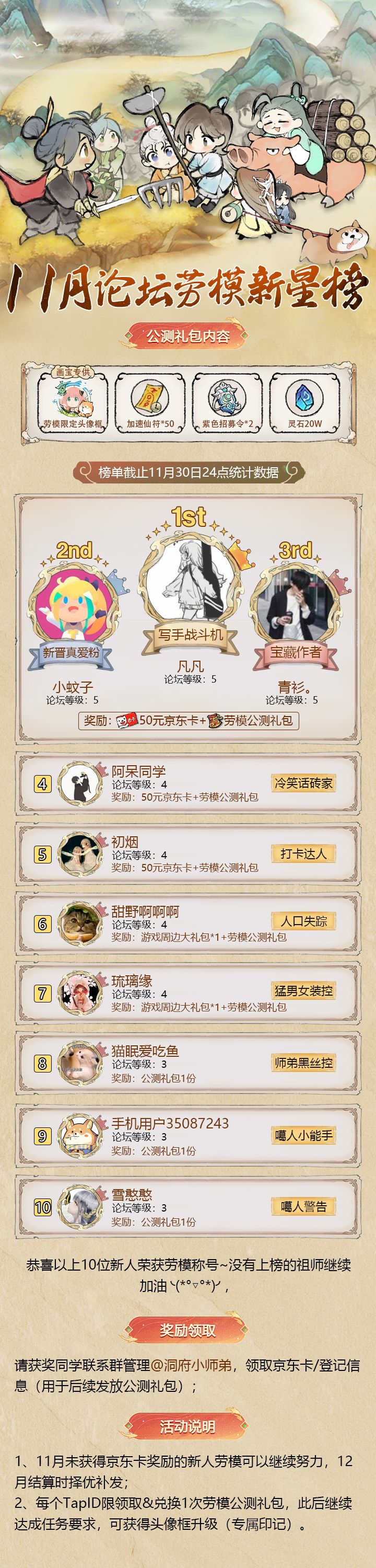 祖师们,大家好呀~这次轮到小师弟来给大家颁发「月度劳模表彰大会」的大奖啦!京东卡、游戏周边、公测礼包...你想要的,通通白给!这次是更加激烈的榜单角逐,让我们来看看究竟谁能成功守住自己的位置,又有哪些祖师成为了后起之秀呢——以下为11月新人榜(此前已拿过劳模表彰的祖师未计入)以下为11月劳模总榜&蝉联奖名单:感谢大家在《代号:我的祖师》TapTap社区一起打卡唠嗑的时光,刚刚结束的二测,