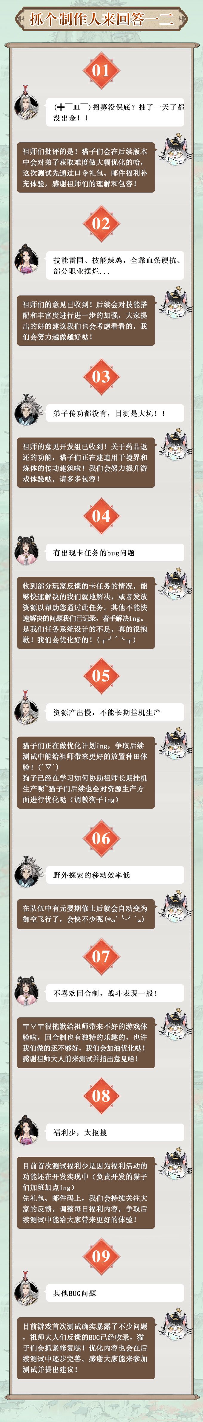 亲爱的祖师:「先行者测试」测试结束已经几天了,偌大的仙山只有小三花和狗子为伴,田不想种了,就连田里的猪看上去都眉清目秀的_(:з」∠)_,翻看着见闻簿上祖师们留下来的点点滴滴,无比怀念,害~还是人多热闹!这几天,猫子们也已经换上了施工队的行头,每天在宗门里“圆桌会议”、敲敲打打,想必来自祖师们的216条建tu议cao已经让猫子们感受到了压力,决心对宗门进行新一轮的建设!希望下次重逢之时,崭新