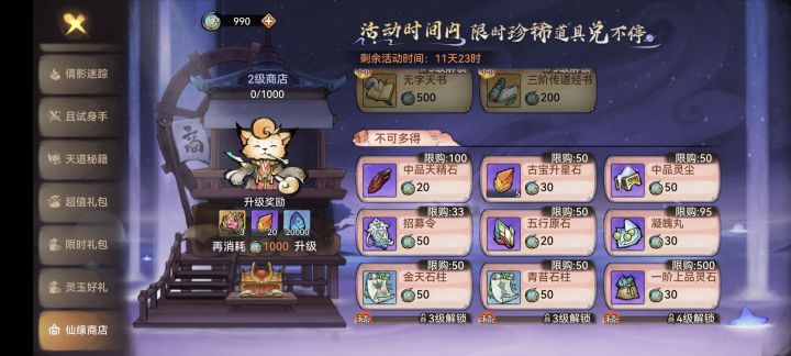 商店优先兑换顺序(建议)尘缘商店:师门令>天命灵魄>九转金丹仙缘商店:混沌天命仙盟贡献:琅璃花>敛息符>神木心仙盟战功:道兵本源>橙色无字天书>功勋宝匣仙盟地宫:道武果>道脉果>道御果>道衍石仙缘商店:优先炼体丹药开3级换天命灵魄论道商店:残日>刑天>乘风跃龙阁:强化鱼线>强化鱼竿>强化鱼钩>兑换鱼饵锁妖塔220层:烈阳>春风化雨>其他斗法商店:天命灵魄许愿商铺:灵叶数量不会