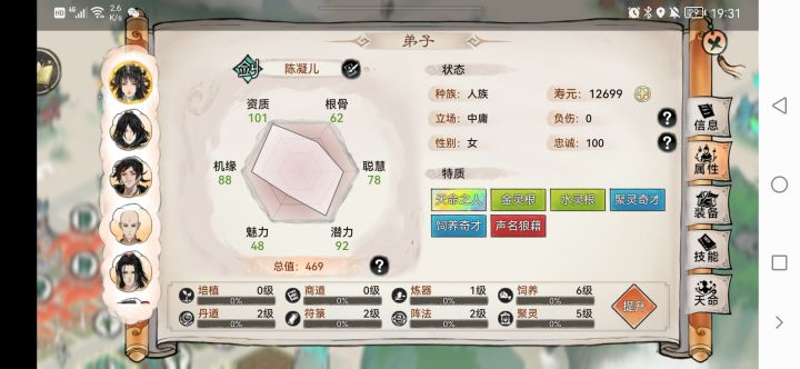 六维属性 资质 根骨 是主要影响弟子培养过程中的修为提升效率。资质 影响弟子境界获取修为的效率包括(服用丹药 )每1点资质额外加成1%根骨 影响弟子炼体获取修为的效率包括(服用丹药)每1点根骨额外加成1%因为每颗丹药包含的经验值是固定的,每一个境界需要的经验修为也是固定,所以100点资质的弟子吃吃一颗药相当于0点资质的弟子吃两颗同样药。所以在选择弟子的时候优先考虑资质高的培养境界,根骨高的